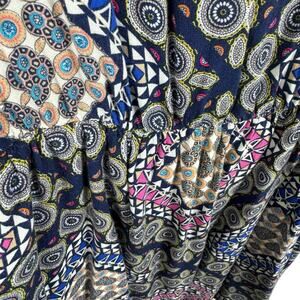 Excellent preowned condition. Multicolor round neck lightweight lined 3/4 cold shoulder balloon sleeve mini dress. Elastic at waist. Has cleavage cutout. Buttons at back of neck. Made in USA. 100% rayon material. Approx. measurements: Shoulder to hem 36", pit to pit 19", sleeve from neck to sleeve hem 24", waist across 12" (super stretchy). Size L.