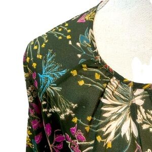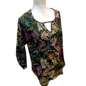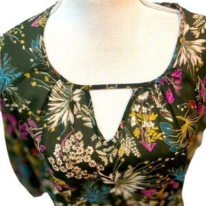 Renee C dark green micro floral blouse keyhole front ruched sleeves size medium