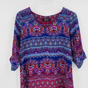 Renee C Size Small Blue & Pink Boho Print V Neck Hi Low 3/4 Sleeve Blouse Top