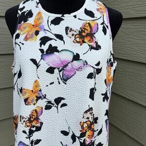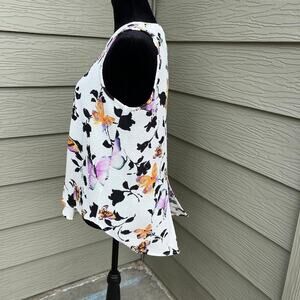 ReneeC. Women’s tank top. *No size tag, although measured 18” from armpit to armpit. Women's size S. This is a white top with black, gold, lavender, and orange floral print. Sleeveless, has a closure with a button in the back, rounded hemline. From the bottom hem up 10 inches is a slit. The fabric is bubble textured.