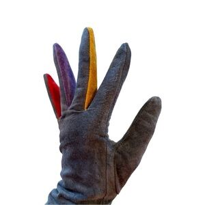 Rene's NYC Accessories gray leather gloves with pops of color at the fingers. Beautiful, soft leather. Lightly lined with a soft fleece.