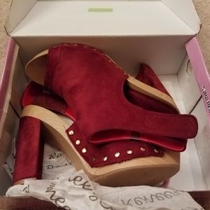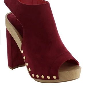 Featuring open toe front,faux suede upper,wrapped chunky heel,metal stud accents detail with slingback. New with Box