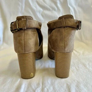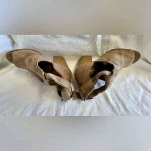 In good condition. Scuff noted on left shoe heel. Otherwise, no major stains or tears noted. 3 inch heels. Suede like material.