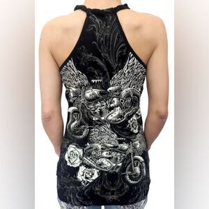 This edgy sleeveless top features a striking black and white graphic rhinestone design, showcasing a motorcycle and roses. The halter neck style adds a sporty touch, making it perfect for those who embody a bold and adventurous spirit.