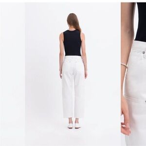 Our take on the classic carpenter pant, made in bull denim. Cut with a high waist and relaxed fit, and cropped just above the ankle. Featuring a 5-pocket design and traditional workwear details, such as front patches and a hammer loop. Also features zip fly closure and branded metal rivets and shank.
