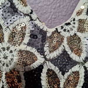 Gold and black sequin fit and flare party dress. Lined with a back zipper. Size 3x. Please use measurements as there is no stretch. Measures: 35" length, 24.5"chest, 21" waist.