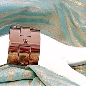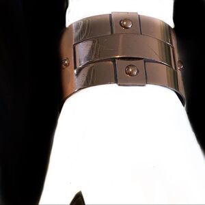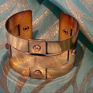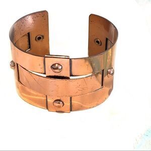 Hard to find mid century copper bracelet by Renior, basket woven design with copper rivets. Warm mellow copper finish , good vintage condition expected surface signs of wear, but over all very nice. This is a big bracelet in design and height, 1.5”, it measures 2.25” across, 1.75” top to bottom, the metal does adjust about a 1” gap at the bottom. Very classic and iconic design. See all photos for full description.