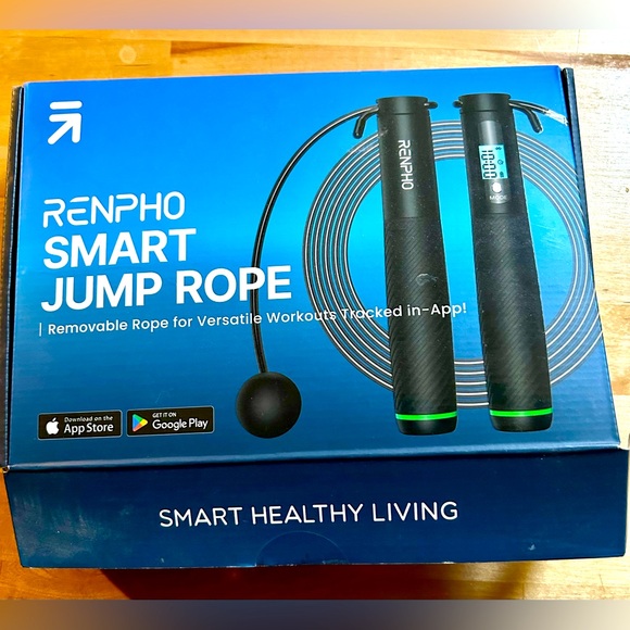 Renpho smart jump rope with digital display. Features removable rope for versatile workouts. Compatible with fitness apps.