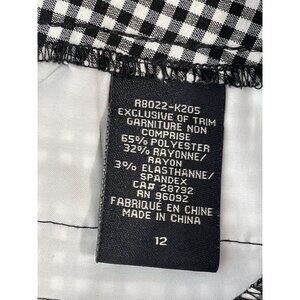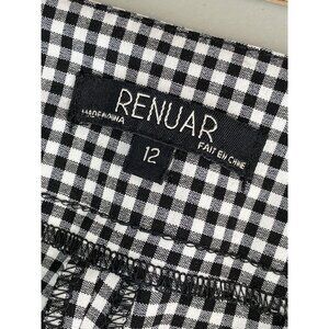 These Renuar tapered leg pants feature a classic black and white gingham check pattern. Designed in size 12, they offer a sophisticated fit with functional pockets and a comfortable blend of polyester, rayon, and spandex.