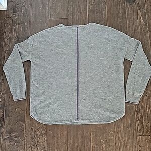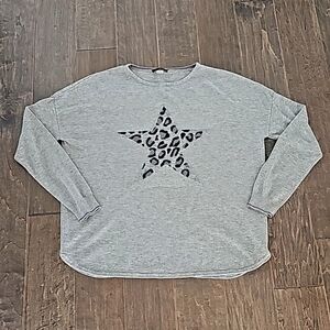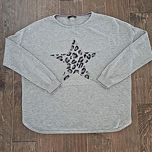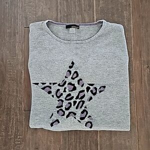 Soft, Light-Weight Renuar Gray Sweater with a Gray and Black Animal Print Star. Sleeves are 3/4 Length with a Darker Gray Stripe Down the Middle of the Back and around the Bottom of Each Sleeve.