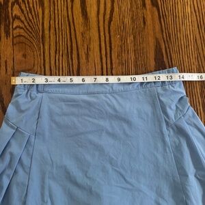 Pull on performance skort with pleated back detailing. Interior bike shorts. Skirt is 16 inches long. Two back zip close pockets and pockets in undershorts for tennis balls. No front/side pockets in the actual skirt. Fabric is nylon spandex performance woven blend. Machine wash. Imported.