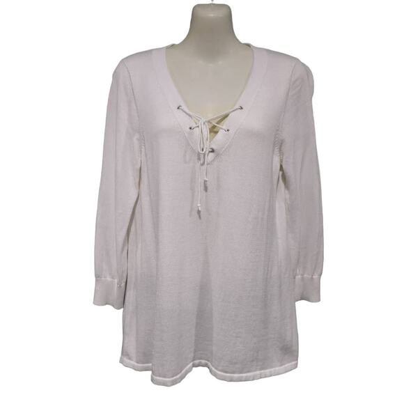 Repeat Lace Up Neck Long Sweater with 3/4 Sleeves, Cream, Size XS