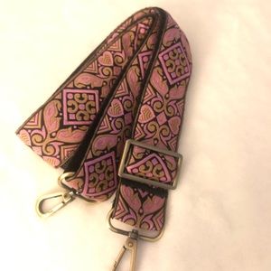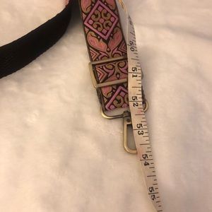 Accessorize your handbag or camera by trading out your plain strap (see pic 3 & 4) for something that will update the entire look of your handbag/camera. This is a pink, black and gold jacquard ribbon backed with a black poly webbing and finished with brass hardware. At its shortest it measures about 30” and at its longest it’s about 53” and it’s 1.5” across. Item is handmade, no 2 items are identical. (HANDBAG/CAMERA NOT INCLUDED).