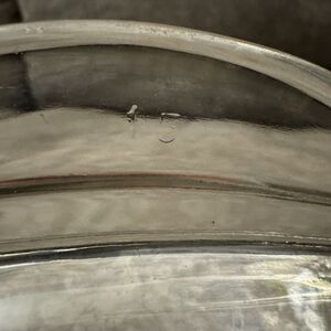 This is in used condition. It has a chip out of the inner lip. It also has some rainbow coloration in a few spots. Please look at pictures for accurate description. 1.5 stamped on one handle. 3055 on the other handle with 4 on the underside.