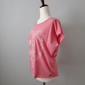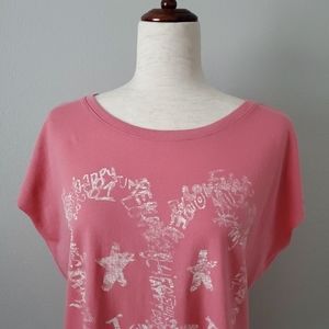 Replay oversized sleeveless tee with raw edges. Salmon colored top has a white abstract heart with a peace sign, smiley face with star eyes. Words like "music, my life, love, & happy" make up the heart frame. Tag says XS but it's way oversized, more like a medium or oversized small. See flat unstretched measurements in photos. This super soft & unique top is in excellent condition.