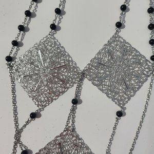 Unworn filigree lariat necklace by jewelry designer Steve Sasco. Inspired by a similar necklace worn by Sharon Tate in the 60s. Extremely lightweight. It's well made to not be heavy at all. Silver color, black beading and lobster clasp closure. Dustbag included.