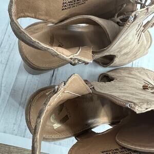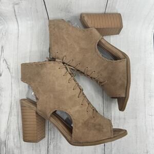 Report (11) BRAID Brown Faux Suede Leather Lace Up Heel Booties Open Toe Chunky Block Heel