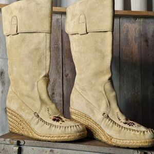 Report Ataani Calf Length Moccasin Style Embroidered Faux Suede Boots Sz 8