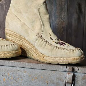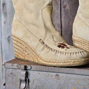adorable embroidered floral design and warm man-made materials, this Report Ataani Women's Suede Espadrille Boot is the perfect fashionable companion as you brave winters fury. Rope sole with rubber bottom Delicately embroidered floral pattern 3-inch heel; 11-inch height Strong double stitching