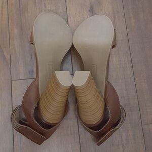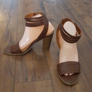 Excellent pre owned condition. Report - Brown Leather High Heel Ankle Strap Sandals. 100% Leather. Multi straps on Vamp and Ankle. Heel measures approximately 4" Adjustable ankle strap with Velcro closure. Open toe silhouette. Leather lining and insole. Stacked chunk heel with synthetic and leather outsole. Imported.