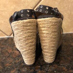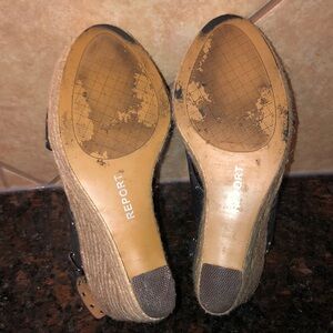 Awesome wedges by Report. Black faux suede with silver grommets. Rope wedge. Wedge is 5 inches, 11/2 at the toe.