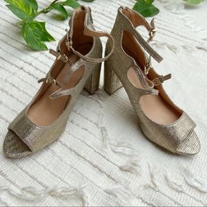 Report Deschutes gold metallic buckle front block heel party sandal Sz 7 NWOT