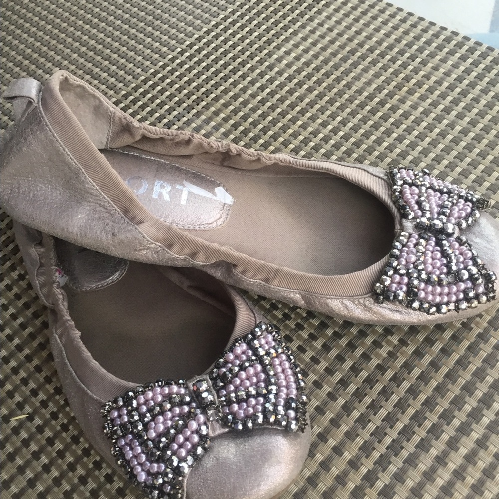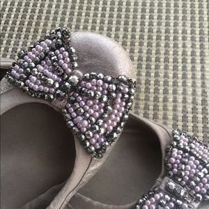 Pewter color with the jeweled bow on toe worn half a dozen times l