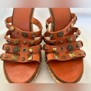 Really cute Sandals that have embellishments on the leather straps. They are in great condition and come from a clean, smoke free home. The highest part of the heel is about 4.5”
