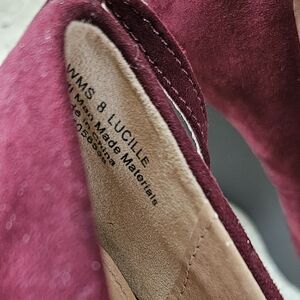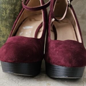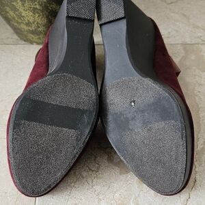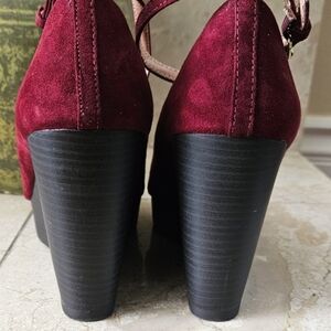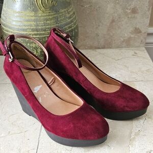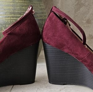 Lovely Report platform wedge with ankle straps. Velvet top in burgundy color. 4.25" wedge with 1" platform. Excellent pre-owned condition. Size is 8