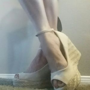 Women's Beige Canvas Peep Toe Wedge