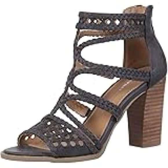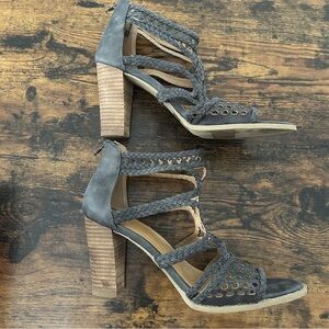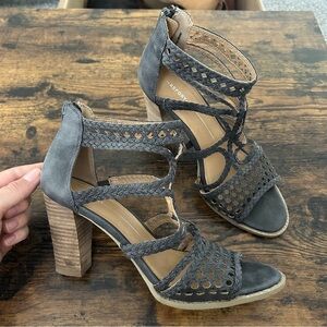 Elegant dark gray heels with intricate strappy design. Perfect for stylish outings.