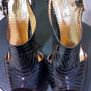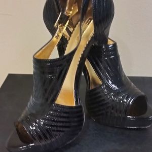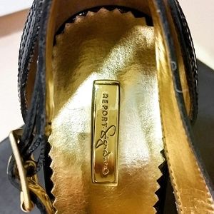 These Report Signature Pamona Leather Strappy heels are show stoppers! Only worn once and still in the original box w/out tags. The soft patent leather, detailing straps, grommet design, buckles, peep toe, leather sole and just describes the word "WOW"! The stiletto heels on these shoes are a perfect match and made for wearing with any type of outfit. These stilettos will turn heads when you step out in them.