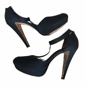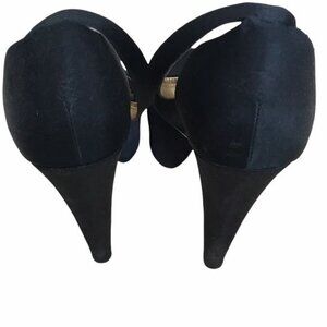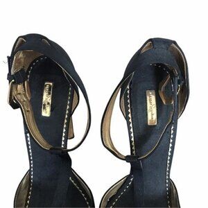 Black stiletto high heels with gold detail and adjustable ankle strap. Preowned with some wear and fabric scartches. 5 inch heel