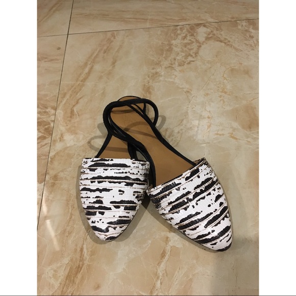 Report Signature Strapped Mules in size 7. These feature a brown on white pattern with a reptile like surface. They also have a strap for the back of the heels.