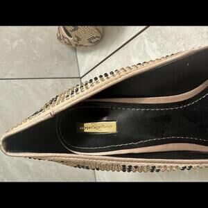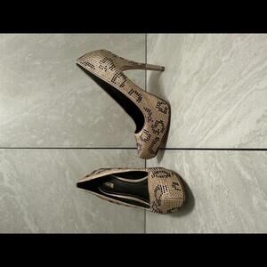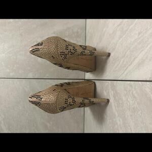Beige w/ gold and black rhinestones; leopard print; hidden platform; 5" heel
