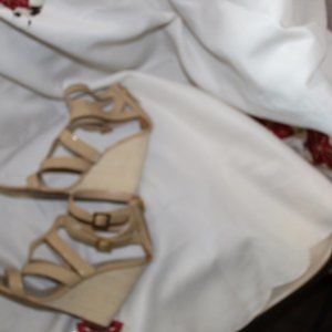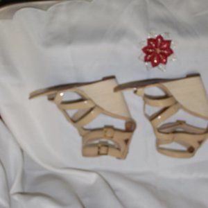 Beautiful flesh/cream color patent leather Report Signature pumps. They have 4" wedge heels and a zipper back. There are two buckles on the ankle strap. size 7.