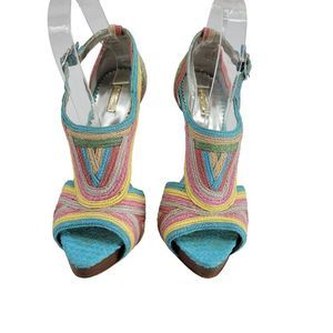 Report Signature Stiletto Heels 8 Pastel Rainbow Stripped Vegan Raffia Wood Heel