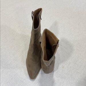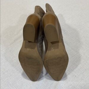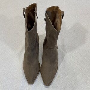 Stylish taupe boots with sleek pointed toes. Comfortable heel for everyday wear.