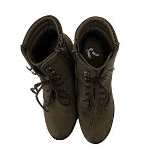 Report Women/Teen Combat Style Boots. Military style olive green boots with 6" inner zippers, lace up with brown strings, brown sole and 3" block heel, round toe. (Size 8) In Good Condition.