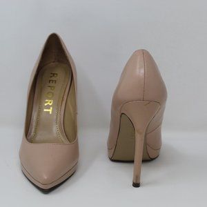 Report pumps with small platform. Heels are approximately 3.5-4". One heel has signs of wear, may be able to repair. Please see pics and ask questions before purchasing. No box.
