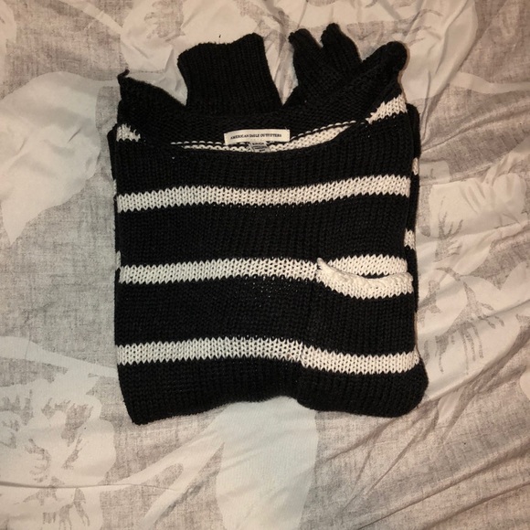 Black and white striped sweater, used condition. No holes or piling. It has a slight fade in color.