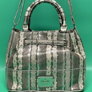 Reptile Print Convertible Handbag NICOLE MILLER Gray Black Multicolor *NEW* EXOTIC!! This is a fun flirty flashy handbag preowned new with tags. There is plenty of room for your essentials with 3 sections to help keep you organized. There is also an exterior zip pocket for your quickly needed items. It is clean inside and outside with no flaws seen other than NORMAL WEAR but may have MINOR IMPERFECTIONS. Therefore, please consider that as part of the "as described" description on any small spot (discoloration, tarnish, scratch, speck, leather scratch, loose string, etc.) you may find. Measurements are approximate. It has been gently used and stored with care. SUPER NICE BAG!!