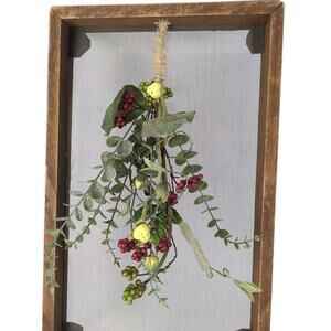 This old wooden framed sifter screen measures 22.5" by 14" and has four wooden feet if laid down flat making it 3.5" deep. It has been repurposed as wall art with twisted sisal rope on the back for hanging and an added bunch of artificial florals & berries wrapped in burlap. The screen is very old while the florals are newer and could be removed or changed if desired.