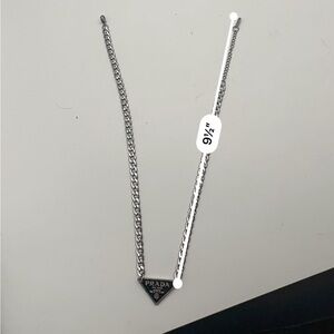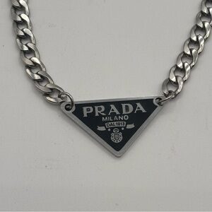 Repurposed/Upcycled Designer black Silver (PRADA) Charm Necklace from Auth Prada bag. Stainless steel chain. I make all these necklaces by hand, so please give me a day to make your order after purchase. Thank you for looking!