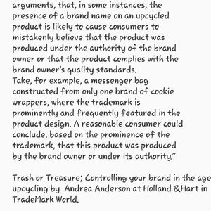 @moonthreads "According to attorney Andrea Sager, “Upcycling is typically fair use. However, upcycling companies are on a VERY fine line. When companies, cut up a used designer handbag and add that material to a different product, even if it’s a product from the same designer, that is crossing the line. Adding fringe and your own touch to a product is fair use. It’s considered art and not illegal. However, if you want to add a protected logo to a different product, that is illegal "