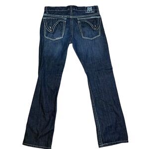 The Request Jeans Men's Size 36x34 Denim Jeans are a vintage-inspired piece with a grunge, 90s, and hip hop theme. Made of cotton denim with a solid blue color, these straight-leg jeans feature a mid-rise fit and a 5-pocket design.