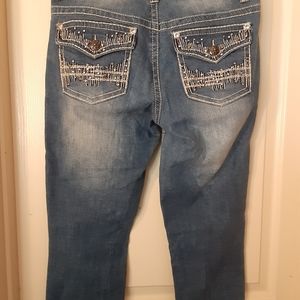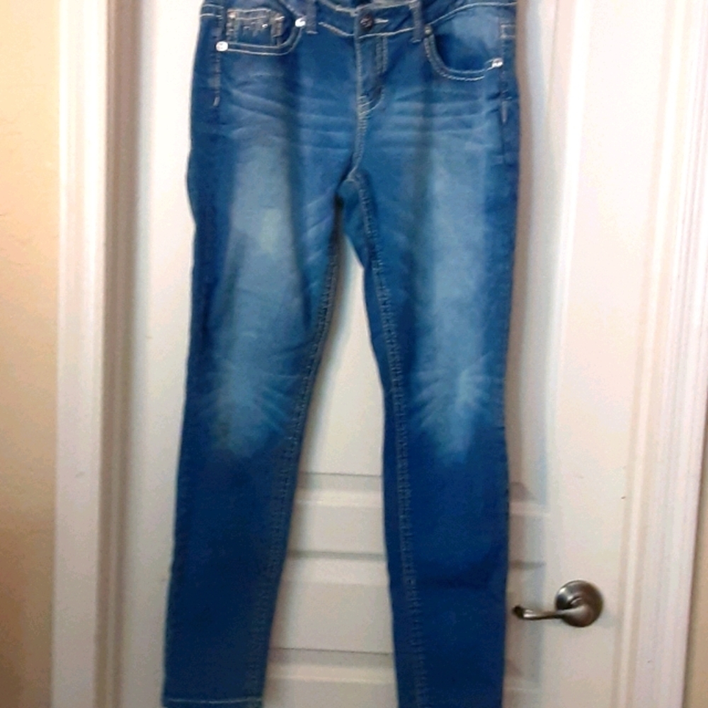 Blue distressed denim s 13 faux diamond front & back pockets