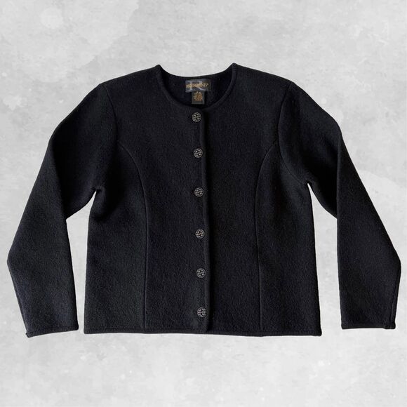 Requirements women's size Medium boiled wool cardigan sweater jacket. Black boiled wool cardigan has a round neckline with six decorative metal buttons. Princess-style seams and long sleeves. This vintage sweater has thin shoulder pads that are easy to remove if you don't want them. Excellent condition. 100% Wool; Dry Clean.