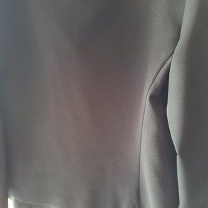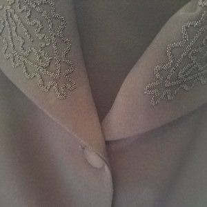 Requirements black fitted jacket with pretty beading on collar and cuffs that dresses it up. Covered buttons; no pockets. Great condition. 100% polyester. 24" across from from underarms; 25"length. Flattering fit. Smoke free, pet free, fragrance free home.