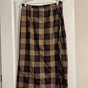Chic plaid midi skirt with a stylish fringe detail. Ideal for versatile wear.